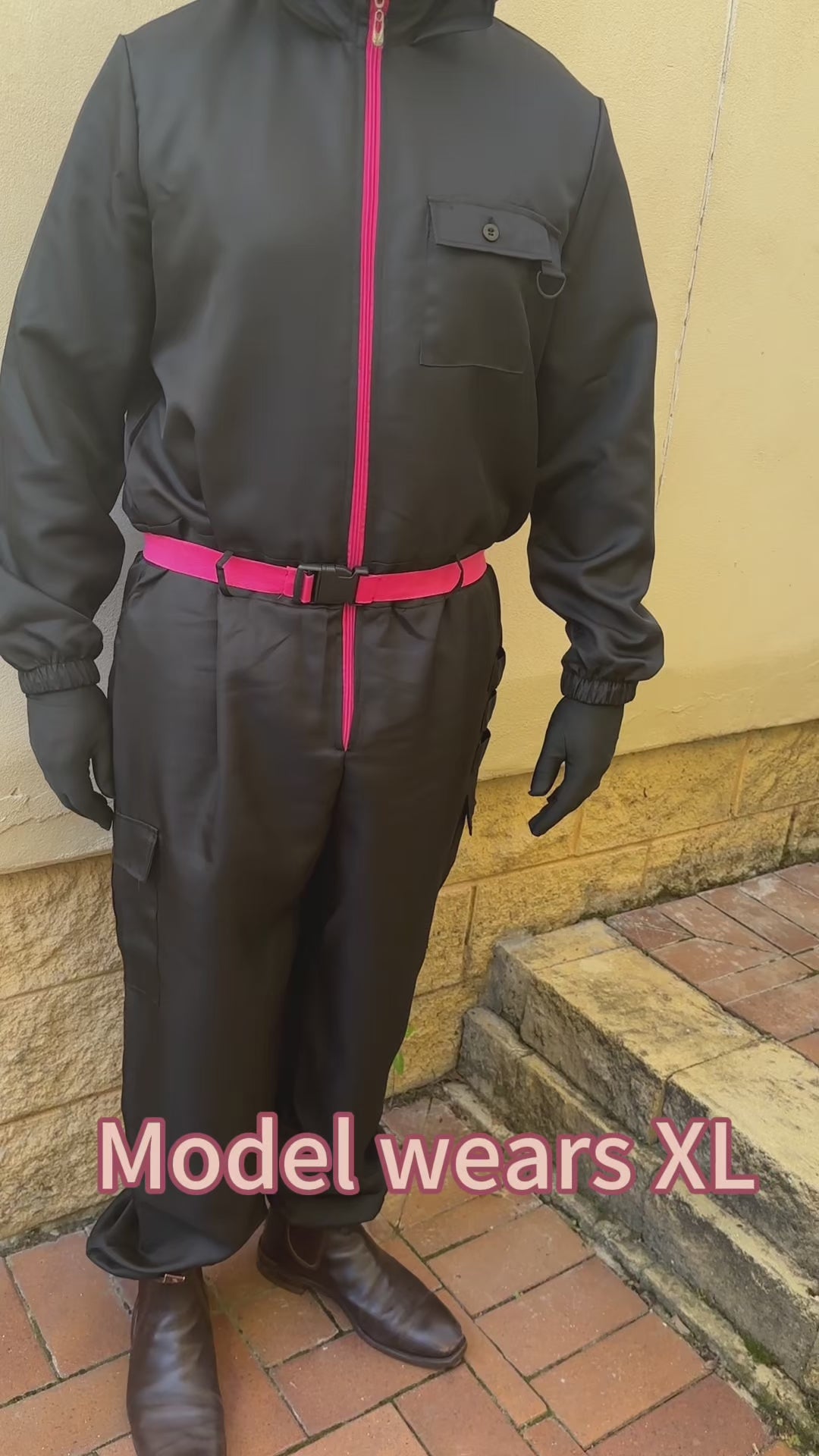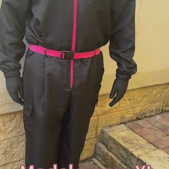 -What’s Included: Black jumpsuit with zipper closure and pockets. Adjustable pink belt. Matching mask with square design.